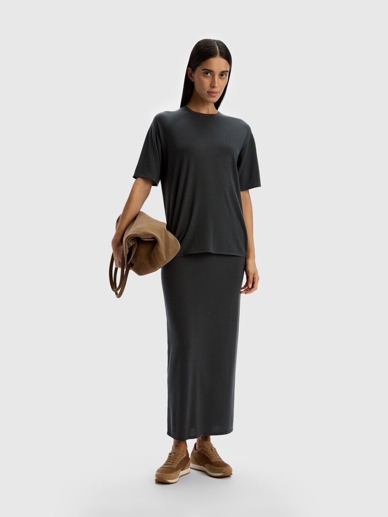 Прямая юбка макси с чуть заниженной посадкой, на тонком эластичном поясе — для повседневных комфортных образов. Сзади — высокий разрез для удобства в движении. Связана мелкими петлями из мягкой, пластичной и износостойкой мериносовой шерсти, которая отлично отводит влагу и совсем не колется. Такой трикотаж получается достаточно плотным и не просвечивает, но мы рекомендуем сочетать юбку с бесшовным бельем. Пожалуйста, обращайтесь с юбкой бережно: острые предметы и аксессуары могут оставить на тонком трикотаже зацепки или повредить нить. У этого изделия низкая пиллингуемость. При правильном уходе первые пилли могут появиться на нем в среднем через 10 носок.