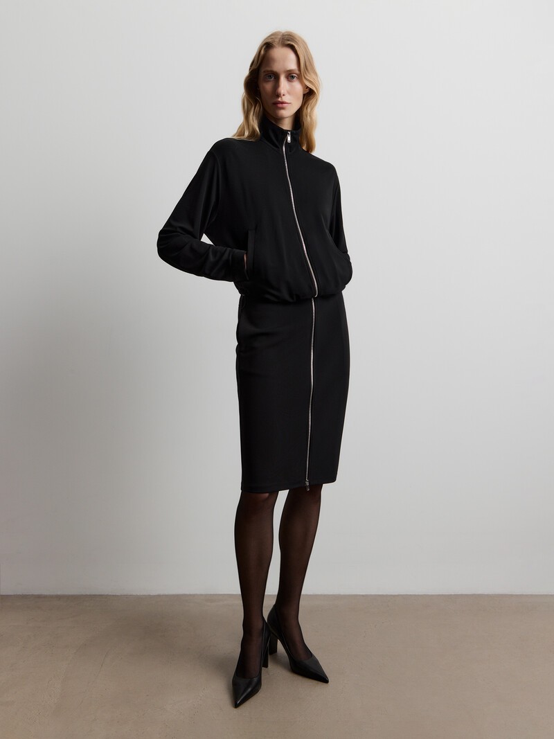Универсальная и комфортная юбка на двухзамковой молнии — с ней можно регулировать высоту разреза, как хочется. Выполнена из гладкого трикотажного крепа, который хорошо держит форму и не требует особого ухода. Сделано в Китае.