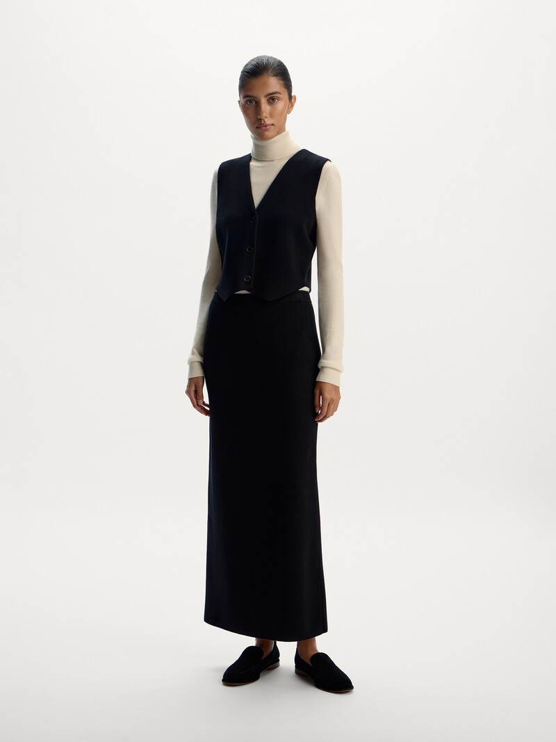 Прямая юбка-карандаш длины макси — с разрезом сзади и на эластичном поясе. Такую можно носить с открытой обувью или ботильонами. Материал — плотный дышащий и слегка согревающий трикотаж из шерсти мериноса и хлопка. Двойное переплетение делает его ровным и гладким. Сочетайте с жилетом и вязаным жакетом из нашей коллекции. У этого изделия низкая пиллингуемость. При правильном уходе первые пилли могут появиться на нем в среднем через 10 носок. Сделано в Китае.