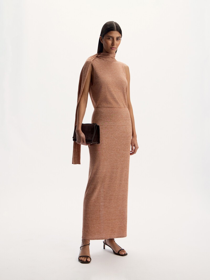 Узкая длинная юбка из тонкой шерсти со льном — незаменимая вещь для лета: она пригодится на вечерней прогулке и выручит в пасмурный день. Теплый карамельный оттенок сочетается с базовыми цветами и делает образ уютным, а прямой силуэт и пояс на эластичной резинке позволят добиться практически идеальной посадки. Тонкий и легкий трикотаж связан гладью — и получился нежарким и приятным на ощупь. У этого изделия низкая пиллингуемость. При правильном уходе первые пилли могут появиться на нем в среднем через 10 носок. Сделано в Китае.