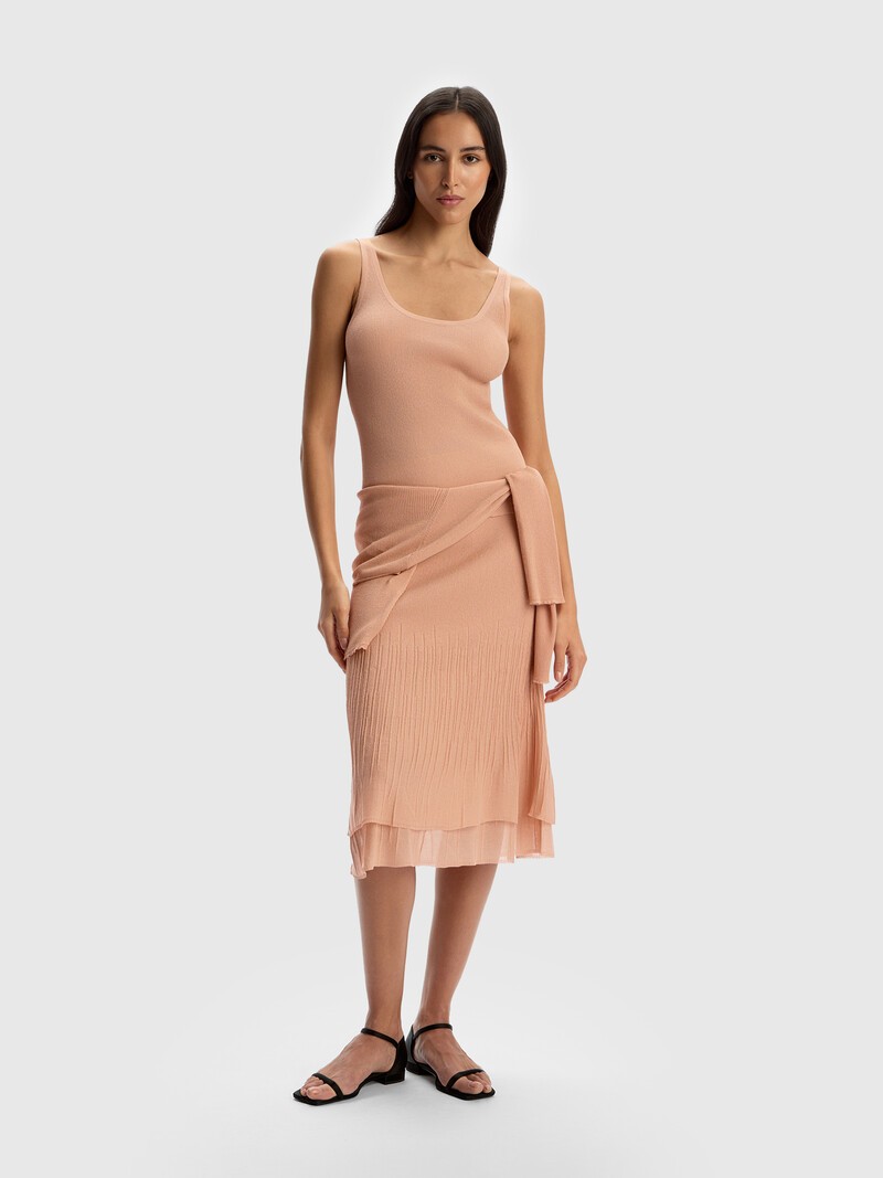 Двухслойная юбка из нежного полупрозрачного трикотажа — комфортная длина до середины голени, тонкий эластичный пояс, спокойный оттенок. Благодаря особенностям переплетения она слегка расширяется книзу и удобна в движении. Связана из гладкой шелковистой пряжи на основе вискозы. Сочетайте с кардиганом и топом из нашей коллекции. У этого изделия низкая пиллингуемость. При правильном уходе первые пилли могут появиться на нем в среднем через 10 носок.