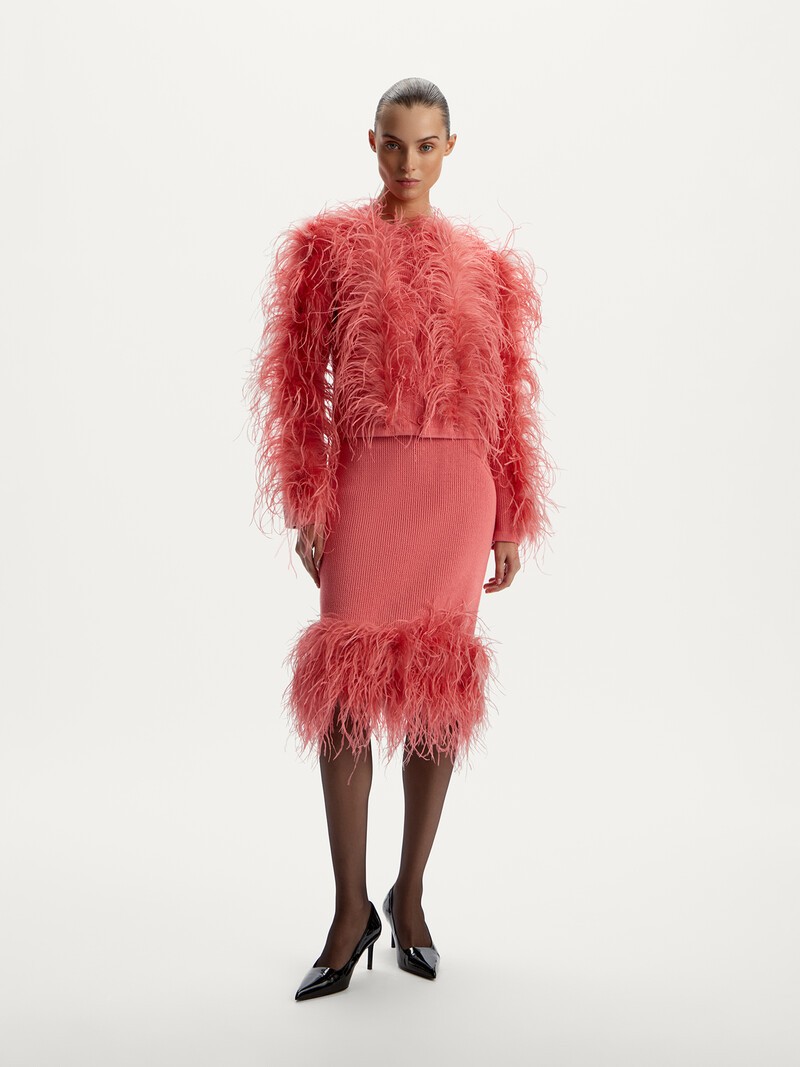 Удобная прямая юбка с эластичным поясом и воздушным декором из пушистых перьев — для вечеринок без повода и уютных семейных праздников. Связана из 100% мерсеризованного хлопка — пластичного, гладкого, дышащего и с деликатным блеском. Сочетайте с базовой белой футболкой, боди или водолазкой — или с жакетом из нашей коллекции. Натуральные перья могут естественным образом ломаться и выпадать. Пожалуйста, обращайтесь с ними бережно и обязательно отпарывайте боа, перед тем как отдать изделие в химчистку. У этого изделия низкая пиллингуемость. При правильном уходе первые пилли могут появиться на нем в среднем через 10 носок. Сделано в Китае.
