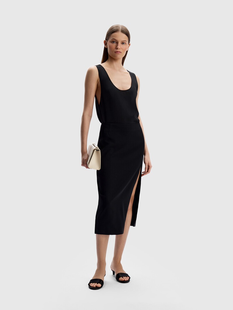 Минималистичная юбка-колонна — комфортная чуть заниженная посадка, вытачки и вертикальный разрез, который красиво распахивается в движении. Выполнена из пластичной и легкой ткани, напоминающей плотный шелк, от нашего португальского поставщика Riopele и дополнена подкладкой из крепового шифона. Застегивается на молнию. Сделано в Турции.