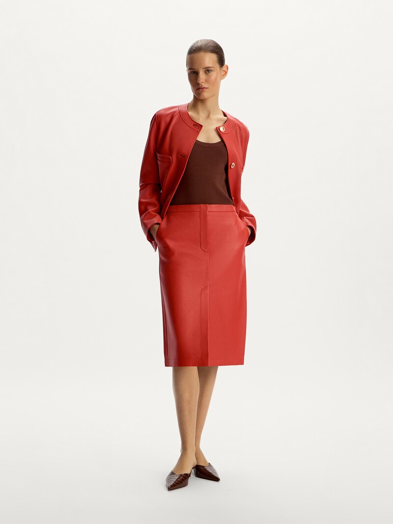 Прямая комфортная юбка миди из плотной, мягкой и тонкой кожи ягненка. Мы выбрали для нее насыщенные оттенки, которые освежат гардероб в межсезонье и холода. Застегивается на долговечную молнию Riri и имеет эластичную подкладку. При выборе размера убедитесь, что юбка сидит свободно — это важно, чтобы изделие служило вам как можно дольше и меньше растягивалось. Комбинируйте с жакетом из нашей коллекции. Серебряный статус LWG означает, что фабрика сводит к минимуму расходы электроэнергии и применение химикатов при обработке кожи, количество отходов и загрязнение сточных вод. Сделано в Турции.