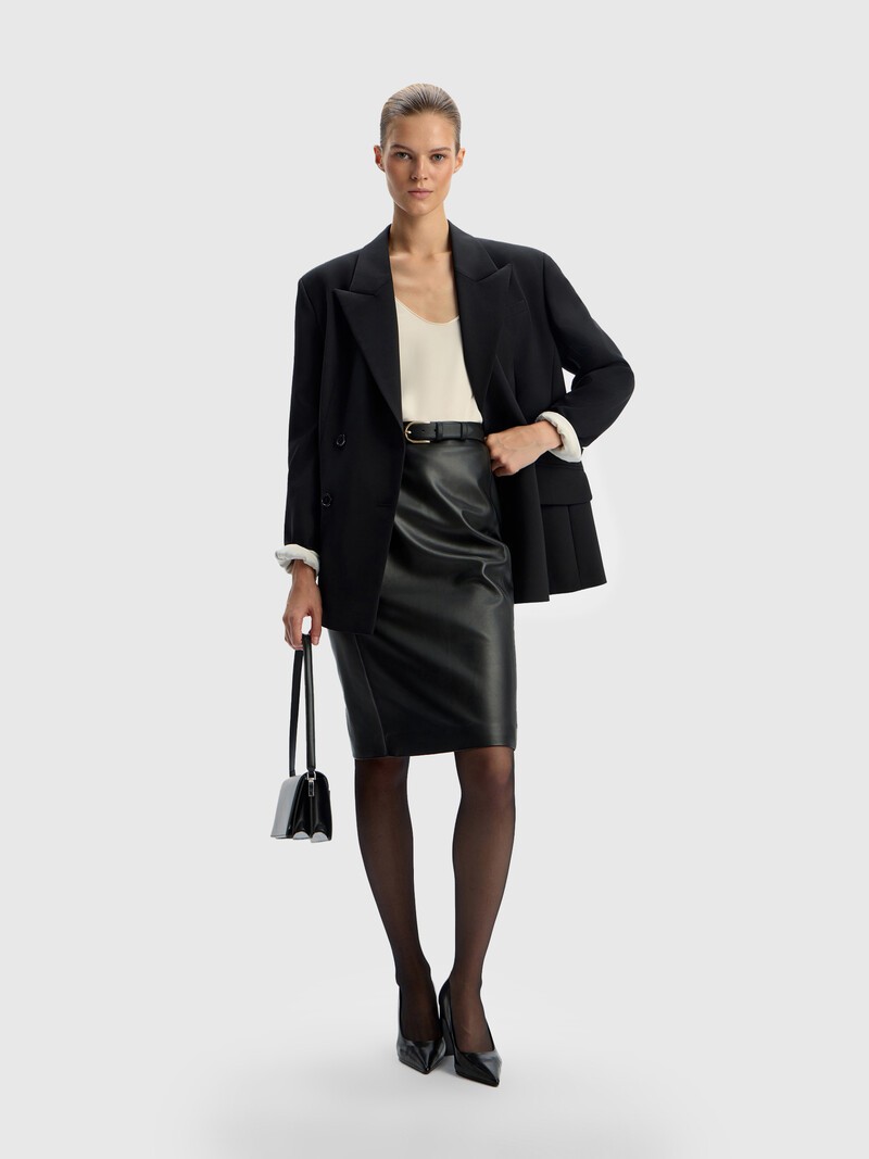 Аккуратная юбка-карандаш — без пояса, с комфортной средней посадкой, универсальной длины до середины колена. Такая модель идеально садится по фигуре благодаря отсутствию боковых швов. Материал — плотная, мягкая и тонкая кожа ягненка, прошедшая минимум обработок. Застегивается на потайную молнию. На эластичной подкладке. При выборе размера убедитесь, что юбка сидит свободно — так она прослужит вам намного дольше. Серебряный статус LWG означает, что фабрика сводит к минимуму расходы электроэнергии и применение химикатов при обработке кожи, количество отходов и загрязнение сточных вод. Сделано в Турции.