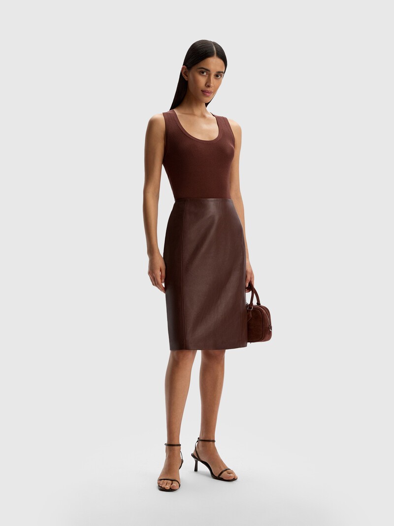 Аккуратная юбка-карандаш из плотной, тяжелой лакированной кожи ягненка — без пояса, с комфортной средней посадкой, универсальной длины до середины колена. Такая модель идеально садится по фигуре благодаря отсутствию боковых швов. Застегивается на потайную молнию. На эластичной подкладке. Сочетайте с бомбером из нашей коллекции. При выборе размера убедитесь, что юбка сидит свободно — так она прослужит вам намного дольше. Золотой статус LWG означает, что фабрика полностью отвечает требованиям к экологической безопасности процессов и химикатов, имеет все необходимые очистные сооружения и заботится о здоровье сотрудников.