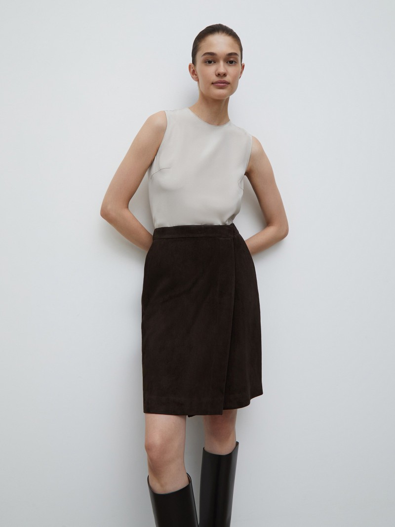 Кожаная юбка с запáхом — универсальная модель, которую можно стилизовать и для вечера, и для офиса. Модель выполнена из мягкой и пластичной замши с приятным на ощупь бархатистым ворсом. Кожа проходит тщательный отбор и минимум обработок, что сохраняет ее природную прочность и красоту. При выборе размера убедитесь, что юбка сидит свободно — это важно, чтобы вещь служила вам как можно дольше. Сделано в Турции.