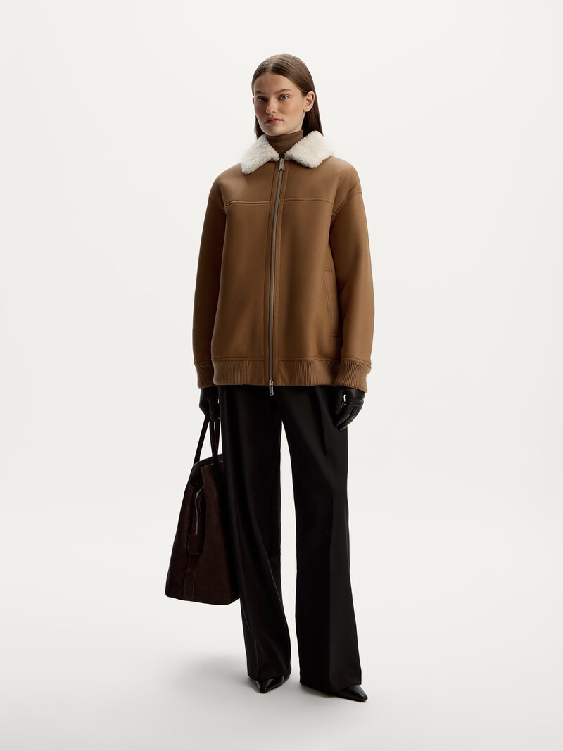 Стилизованная под объемный бомбер дубленка создана из мягкой овчины с нежным на ощупь густым мехом, завитки которого сохраняют тепло. Тщательно отобранная кожа с ровной бархатистой текстурой покрыта тонким слоем специальных смол: они защищают деликатный материал от потертостей и случайных пятен, которые обычно оставляет на коже влага. Застежка на двухзамковую молнию Riri позволяет расстегнуть дубленку снизу во время сидения. Сделано в Турции.