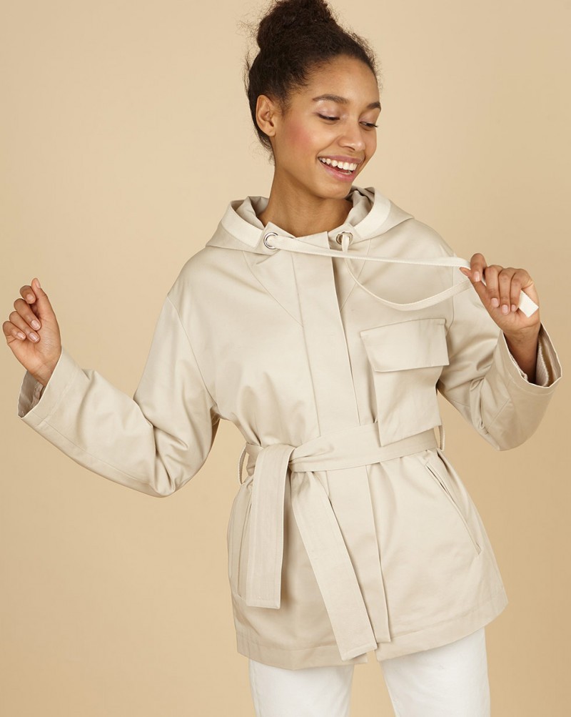 Легкая куртка с капюшоном. Прямой крой, съемный пояс на шлевках, с помощью которого можно подчеркнуть талию. Прорезные вертикальные карманы в рамку, один накладной карман на груди с широким клапаном. Ширину капюшона можно регулировать, благодаря протянутой в нем ленте из основной ткани. Куртка выполнена из плотного хлопка, без подкладки. Сделано в России