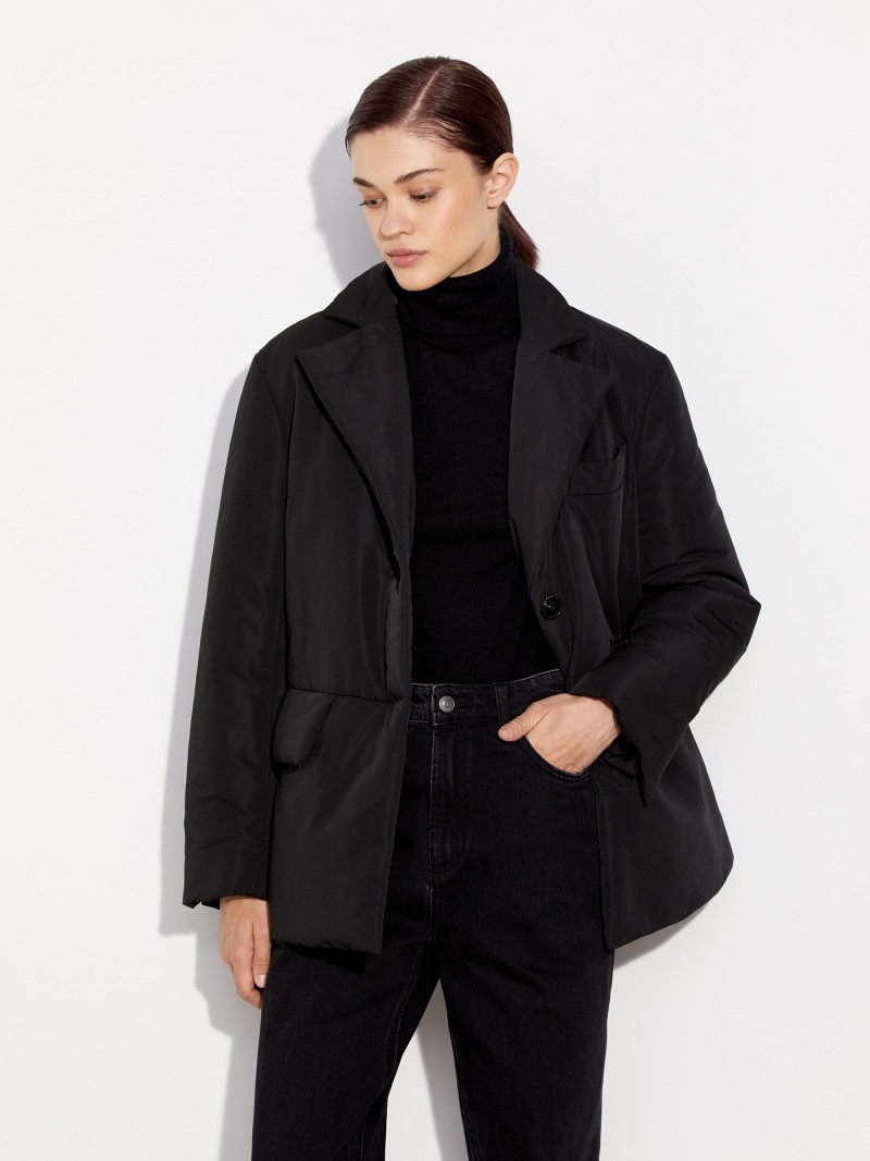 Куртка с тонким утеплителем. Универсальная куртка в стиле мужского пиджака — подчеркните талию ремнем или поясом или оставьте силуэт объемным, если хочется больше свободы. - Прямой свободный силуэт - Однобортная застежка на две пуговицы - Матовая и гладкая плащевая ткань - Легкая влагоотталкивающая пропитка: материал не пропускает ветер и влагу за счет плотности, но промокает под сильным снегопадом или дождем - Каландрированный синтепон равномерно распределяется и не выбивается в швах - Вес утеплителя — 160 гр Сделано в Китае.
