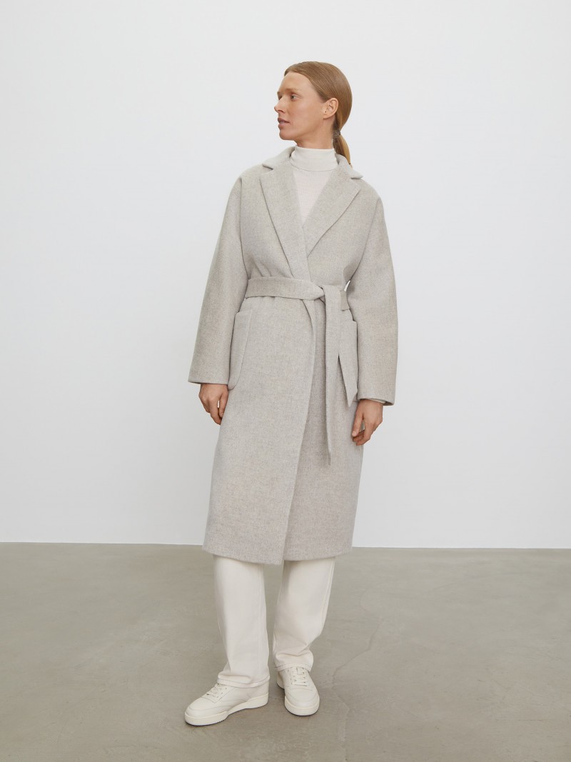 Пальто-халат, зауженное к низу. Отложной воротник с лацканами, цельнокроенный рукав. Два глубоких накладных кармана, съемный пояс. Легкий материал из смеси шерсти и кашемира.На подкладке. Температурный режим — до +5 °C. Сделано в России