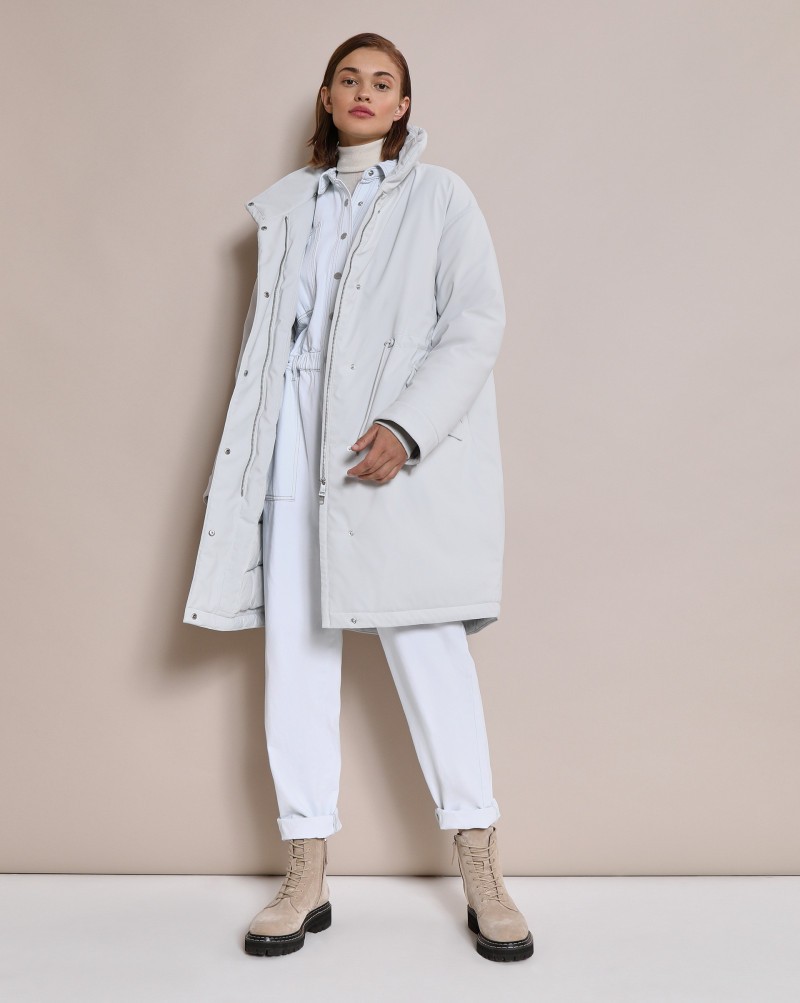 Парка с меховым воротником. Прямой силуэт, кулиска на талии и кулиска по асимметричному нижнему краю. Ширину манжеты можно регулировать с помощью кнопки, внутри рукава — дополнительная вязаная манжета для защиты от ветра. Застежка на молнию, закрытую ветрозащитной планкой с кнопками. Воротник из мягкого и пушистого меха можно отстегнуть. Пуховик выполнен их двухслойной непродуваемой ткани с тонким слоем флиса. Ткань бархатистая, приятная на ощупь, не шуршит и визуально напоминает хлопок. Внутри парки — наполнитель из 90% пуха и 10% пера отборного качества. Сочетание пуха и плотного материала с флисом делает модель особенно теплой, а меховой воротник дополнительно защищает шею. Температурный режим — до -15 °C. Сделано в Китае.