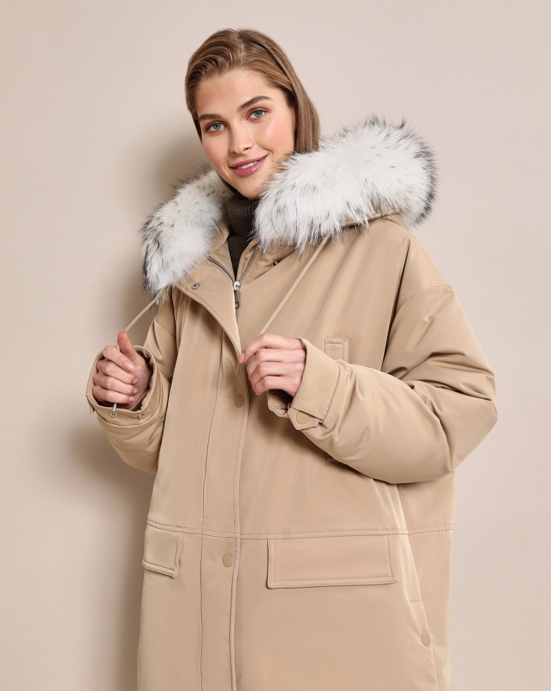 Удлиненная парка с водоотталкивающим покрытием. Застежка на молнию, ветрозащитная планка с кнопками. Капюшон оторочен отстегивающимся мехом енота. Вам будет тепло и удобно даже в самую холодную погоду благодаря наполнителю на пуху. Температурный режим — до -15 °C. Сделано в Китае