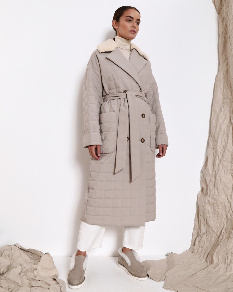 Пальто из плащевой ткани. Двубортное пальто прямого силуэта с застежкой на пуговицы. Отложной воротник с широкими треугольными лацканами дополнен мягким и долговечным искусственным мехом, который можно отстегнуть. Пальто выполнено из матовой плащевой ткани со специальной водоотталкивающей пропиткой. Утеплитель — Siberia 110 гр, легкий, дышащий. Пальто можно носить с поясом и высокими сапогами, или без пояса — с ботинками и джинсами. Температурный режим — до +5 °C. Сделано в Китае.