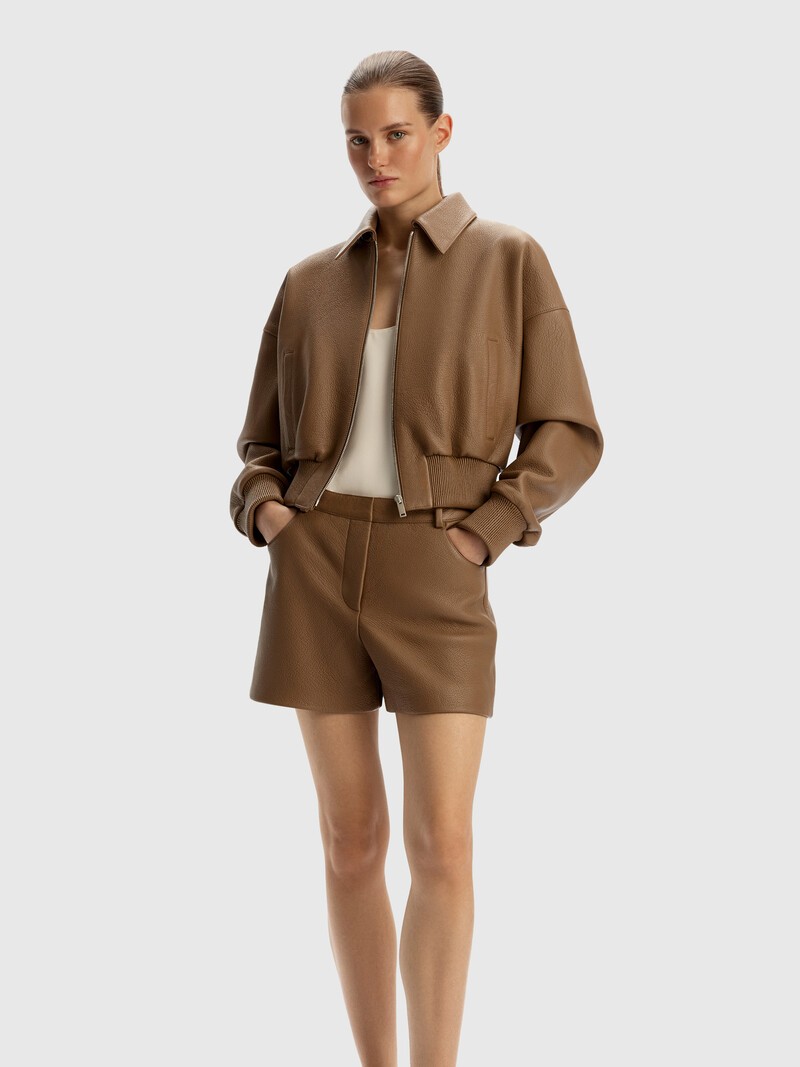 Укороченный бомбер из фактурной кожи подчеркивает талию за счет свободного силуэта и нарочито широких пройм. Благодаря минимальным обработкам пластичный, мягкий и ровный материал с природным рисунком пор сохраняет свои лучшие свойства. На бархатистой подкладке из купро. Застегивается на итальянскую металлическую молнию с плавным ходом. Сочетайте с шортами из нашей коллекции, широкими джинсами или юбками. Золотой статус LWG означает, что фабрика полностью отвечает требованиям к экологической безопасности процессов и химикатов, имеет все необходимые очистные сооружения и заботится о здоровье сотрудников.