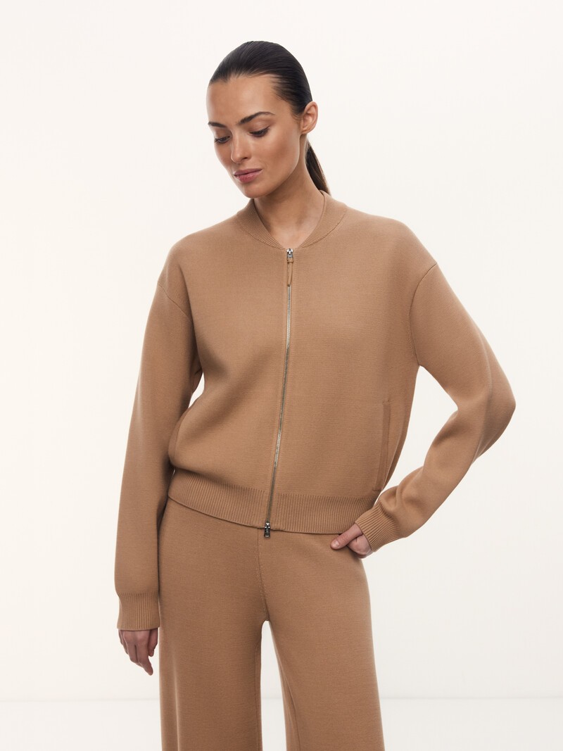1. Плотное комбинированное переплетение: трикотаж гладкий и практичный, не мнется и не вытягивается 2. Удобная застежка на молнию с пуллером из натуральной кожи 3. Подчеркивает фигуру: мы сделали бомбер укороченным и не слишком объемным