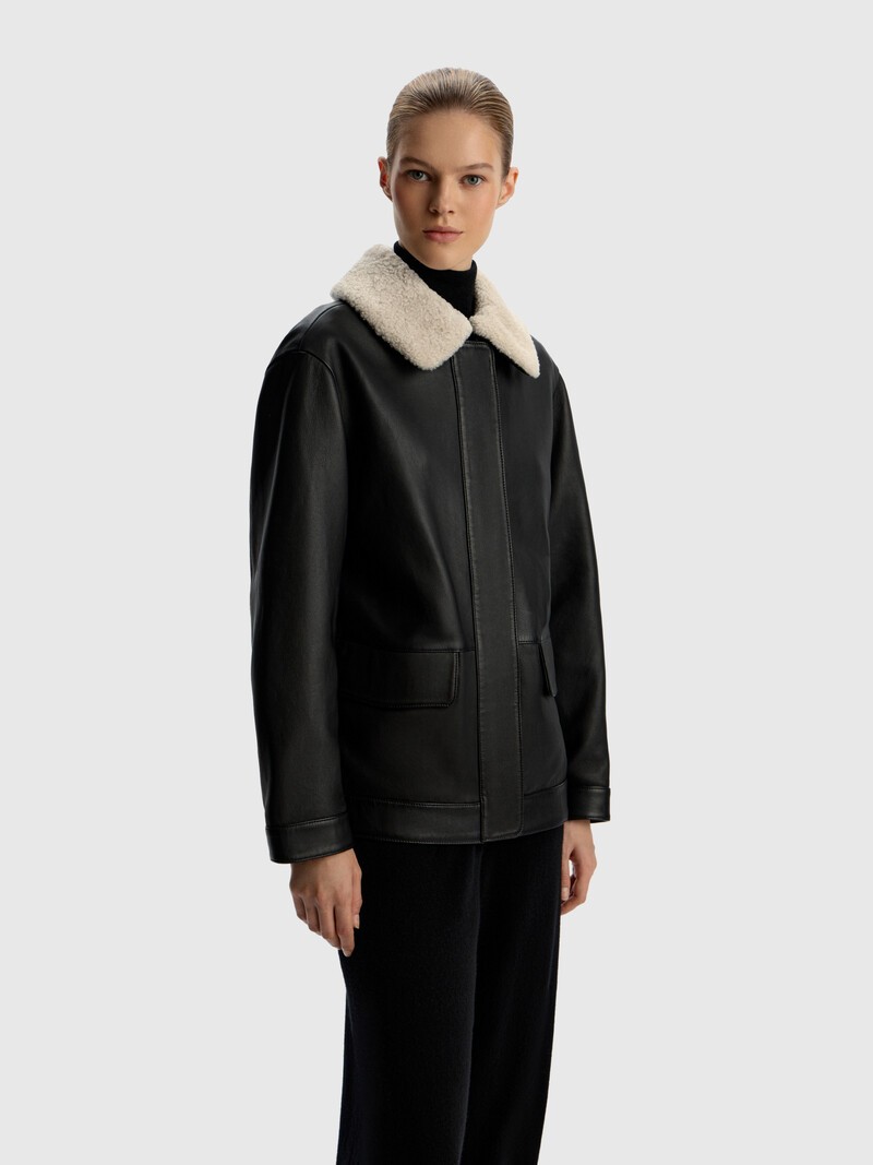 Сходство с бомбером придает этой куртке непринужденность, а свободный силуэт позволяет надеть вниз уютный джемпер. Если хочется сделать модель более легкой, воротник из стриженой овечьей шерсти можно снять. Чтобы сохранить все плюсы натуральной кожи, материал тщательно отобрали и бережно обработали без использования силиконов и плотных финишей. На подкладке. Серебряный статус LWG означает, что фабрика сводит к минимуму расходы электроэнергии и применение химикатов при обработке кожи, количество отходов и загрязнение сточных вод.