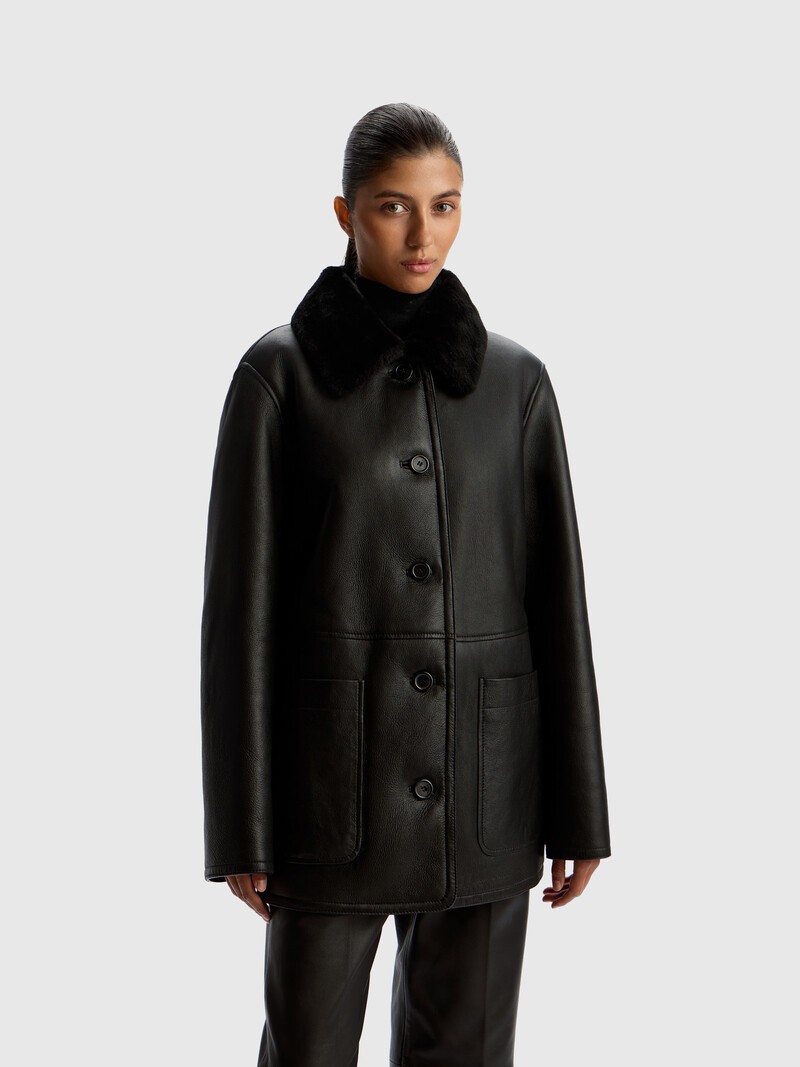 Легкая дубленка из тонкой испанской овчины с густым курчавым мехом — комфортная и универсальная. Прямой силуэт, классическая длина, большие накладные карманы и застежка на пуговицы позволят вписать ее в любой гардероб. Выберете ли вы платье или джинсы — образ получится уютным и женственным. А защитное покрытие позволит надолго сохранить природные свойства материала и обеспечит устойчивость к царапинам.