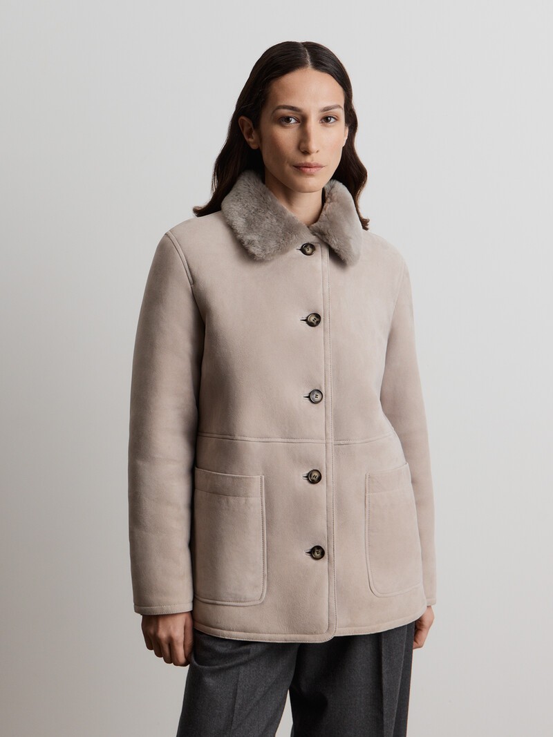 Дубленка из бархатистой испанской овчины с густым и плотным мехом. Силуэт модели напоминает прямой жакет с накладными карманами, благодаря чему дубленку легко стилизовать: широкие джинсы или классические брюки, кроссовки или высокие сапоги-трубы будут смотреться с ней одинаково гармонично. Бережная обработка кожи позволила сохранить ее пластичность и мягкость, однако материал следует беречь от влаги. Сделано в Турции.