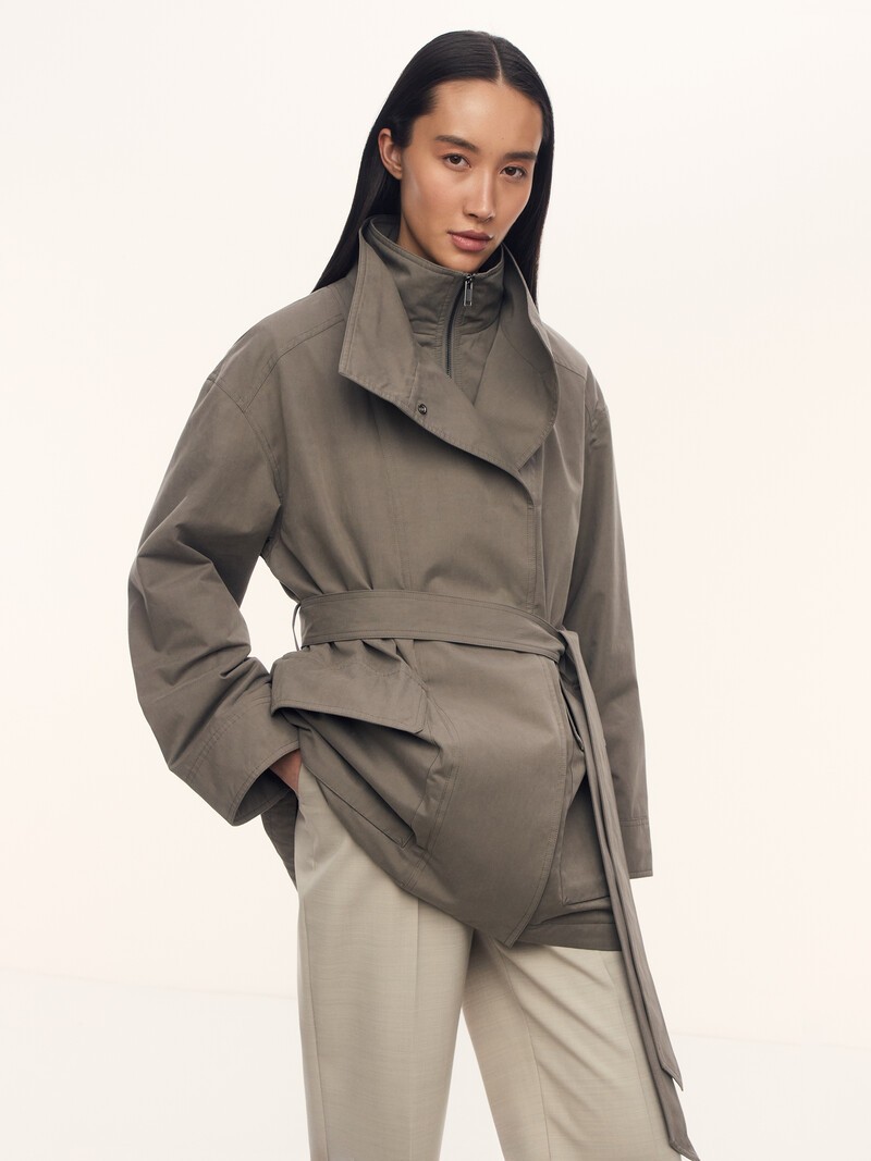1. Мягкая бархатистая на ощупь ткань на основе хлопка от нашего корейского поставщика — дышит и отталкивает легкие осадки благодаря WR-пропитке 2. Создает интересный эффект многослойности за счет кроя 3. Теплая, но без лишнего объема: внутри тонкий каландрированный синтепон, который годами сохраняет форму и остается невесомым 4. Подчеркивает фигуру с помощью кулиски и длинного пояса 5. Комфортная подкладка из шелковистого лиоцелла и шерсти