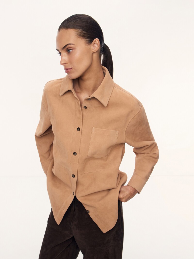 1. Для этой модели мы нашли плотную замшу африканской овцы с мягким ворсом — долговечную и согревающую 2. Можно носить и как куртку до +10 °С — на тонкий джемпер или водолазку 3. Чтобы сделать рубашку легче, мы сшили ее по новой технологии и отказались от подкладки 4. Поставщик, с которым мы сотрудничаем, имеет наивысшую оценку организации по защите окружающей среды LWG — золотой сертификат. Это значит, что фабрика полностью соответствует требованиям экологической безопасности, имеет все необходимые очистные сооружения и заботится о здоровье сотрудников