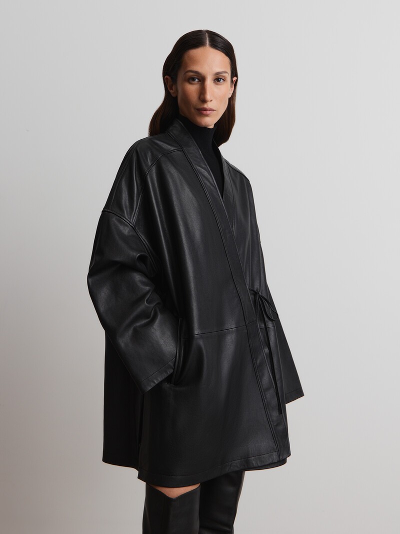 Акцентный кожаный тренч — объемный, асимметричный, с удлиненными рукавами, которые легко подвернуть. Мы выбрали для него плотную кожу ягненка, покрытую тонким слоем лака, который придает материалу легкий блеск и защищает от царапин. Завязывается на кожаные шнурки. На шелковистой подкладке. Золотой статус LWG означает, что фабрика полностью отвечает требованиям к экологической безопасности процессов и химикатов, имеет все необходимые очистные сооружения и заботится о здоровье сотрудников.