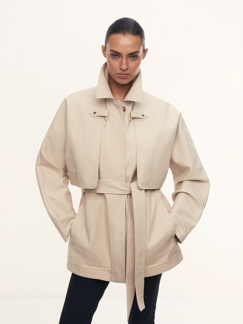 1. 2 в 1: вы можете носить укороченную куртку и жилет вместе или по отдельности, меняя образ под погоду и настроение 2. Мы выбрали для модели очень плотный хлопковый твил с WR-покрытием — приятный на ощупь материал, который отлично держит форму и защищает от легких осадков и ветра 3. Куртка незаметно крепится к жилету кнопками и пуговицей под воротником 4. Чтобы не утяжелять модель, мы отказались от подкладки: все швы с изнанки аккуратно закрыты тесьмой