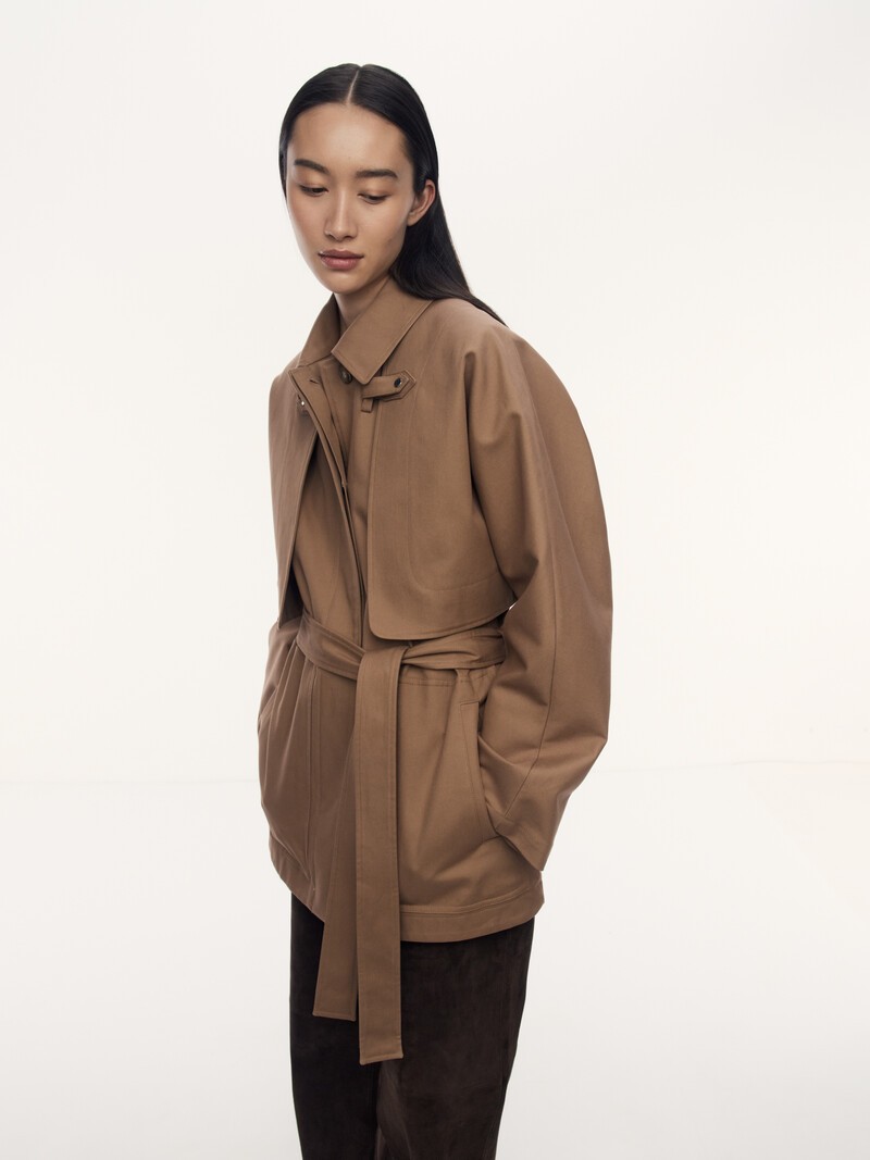 1. 2 в 1: вы можете носить укороченную куртку и жилет вместе или по отдельности, меняя образ под погоду и настроение 2. Мы выбрали для модели очень плотный хлопковый твил с WR-покрытием — приятный на ощупь материал, который отлично держит форму и защищает от легких осадков и ветра 3. Куртка незаметно крепится к жилету кнопками и пуговицей под воротником 4. Чтобы не утяжелять модель, мы отказались от подкладки: все швы с изнанки аккуратно закрыты тесьмой