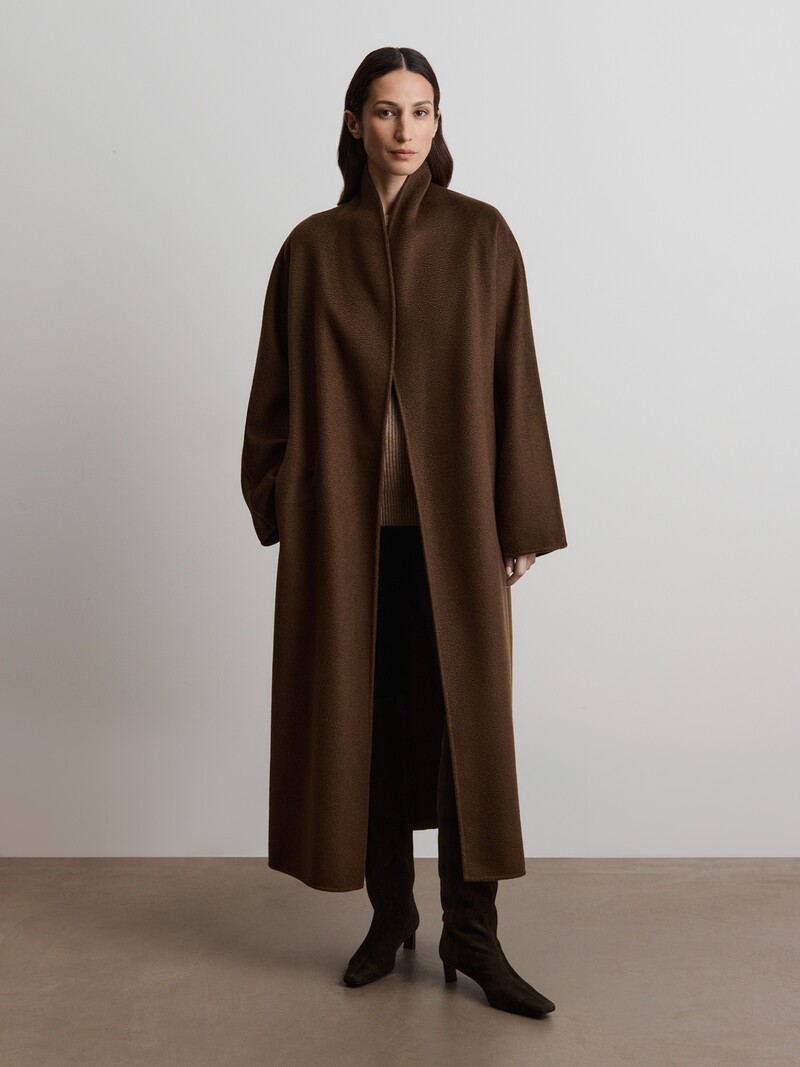 Длинное и просторное пальто-халат из самой ценной ткани в нашей коллекции — 100% монгольского кашемира. Удобная конструкция рукава позволяет носить его даже поверх пиджака или теплого свитера. Выполнено с применением технологии double face — благодаря спаянным швам с изнанки пальто такое же красивое, как и снаружи.