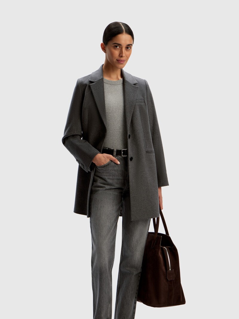 Универсальная длина, классический цвет — эту аккуратную модель в мужском стиле с чуть расширенными плечами, шлицей и листочкой на груди можно носить до первых холодов. Сшито из ткани с длинным пушистым ворсом, дополнено шелковистой подкладкой.
