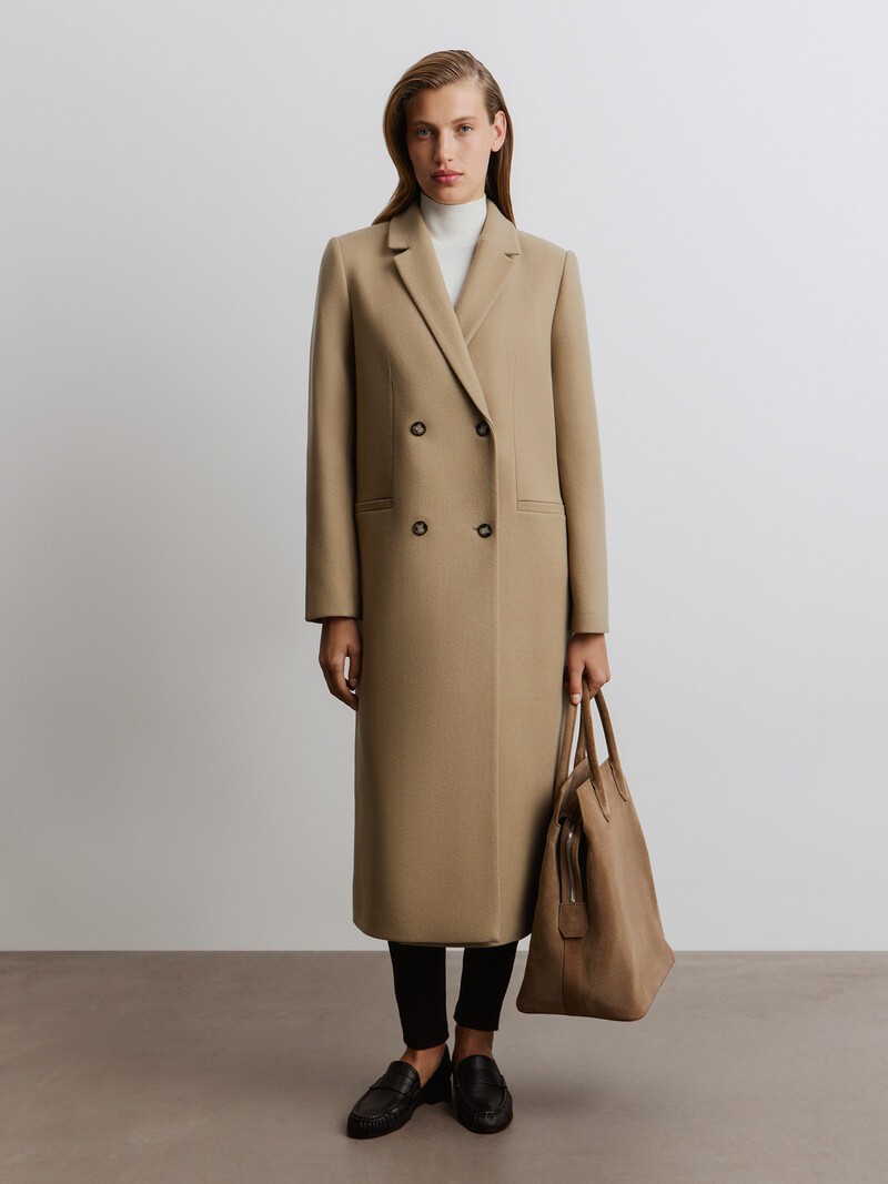 Уютное двубортное пальто длиной до середины икры по крою напоминает мужские модели. Его можно носить даже ранней зимой: прямой свободный силуэт с выраженными плечами позволит надеть под низ и жакет, и свитер. Материал — приятный на ощупь, ворсистый и плотный твил из теплой шерсти и нежного кашемира. Для подкладки мы выбрали шелковистую и мягкую ткань на основе купро. Сделано в Китае.