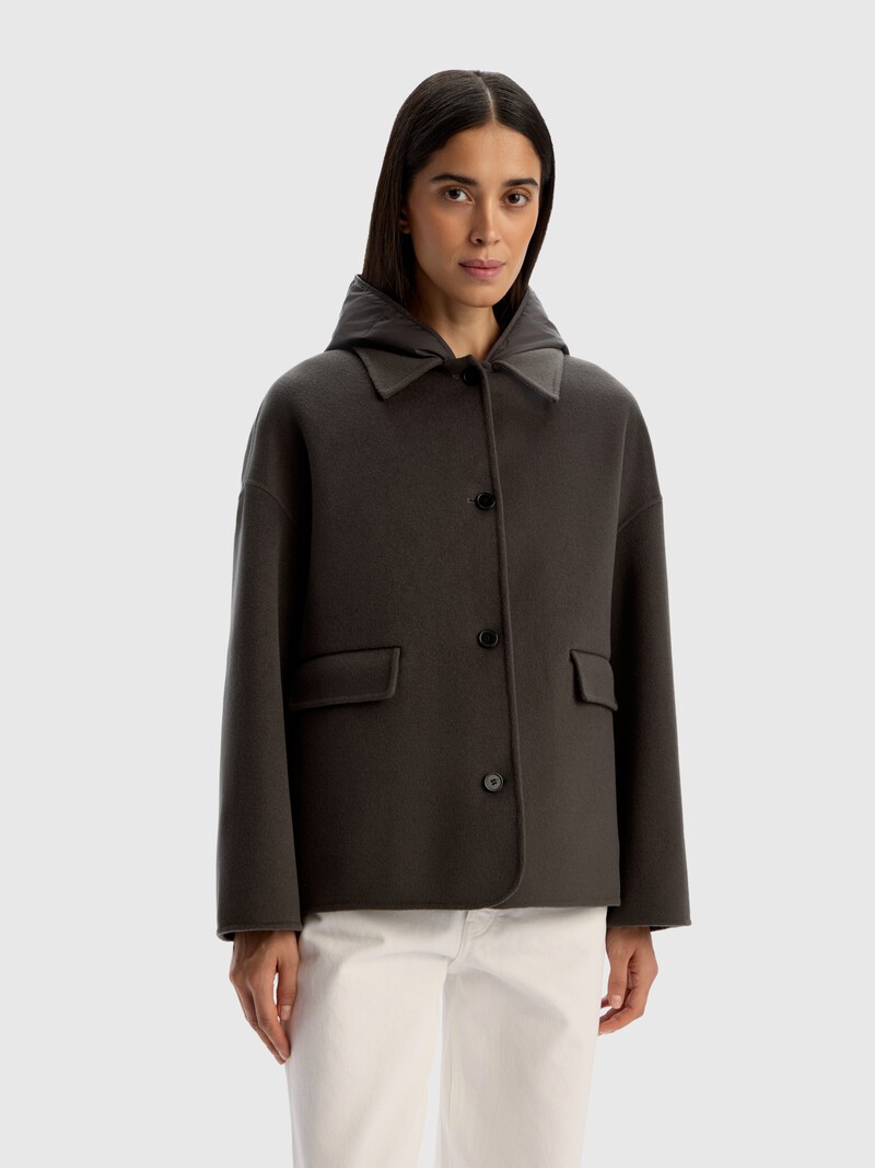 Укороченное пальто со съемной стеганой подстежкой, внутри которой воздушный биопух — достаточно свободное и аккуратное. Карманы с клапанами, чуть спущенное плечо — такую модель легко сочетать как с джинсами, так и с классическими брюками или юбками. Выполнено из 100% шерсти австралийского мериноса, легкой, теплой и совсем не колючей. Пальто без подкладки: два слоя ткани соединены незаметными швами по технологии double face.