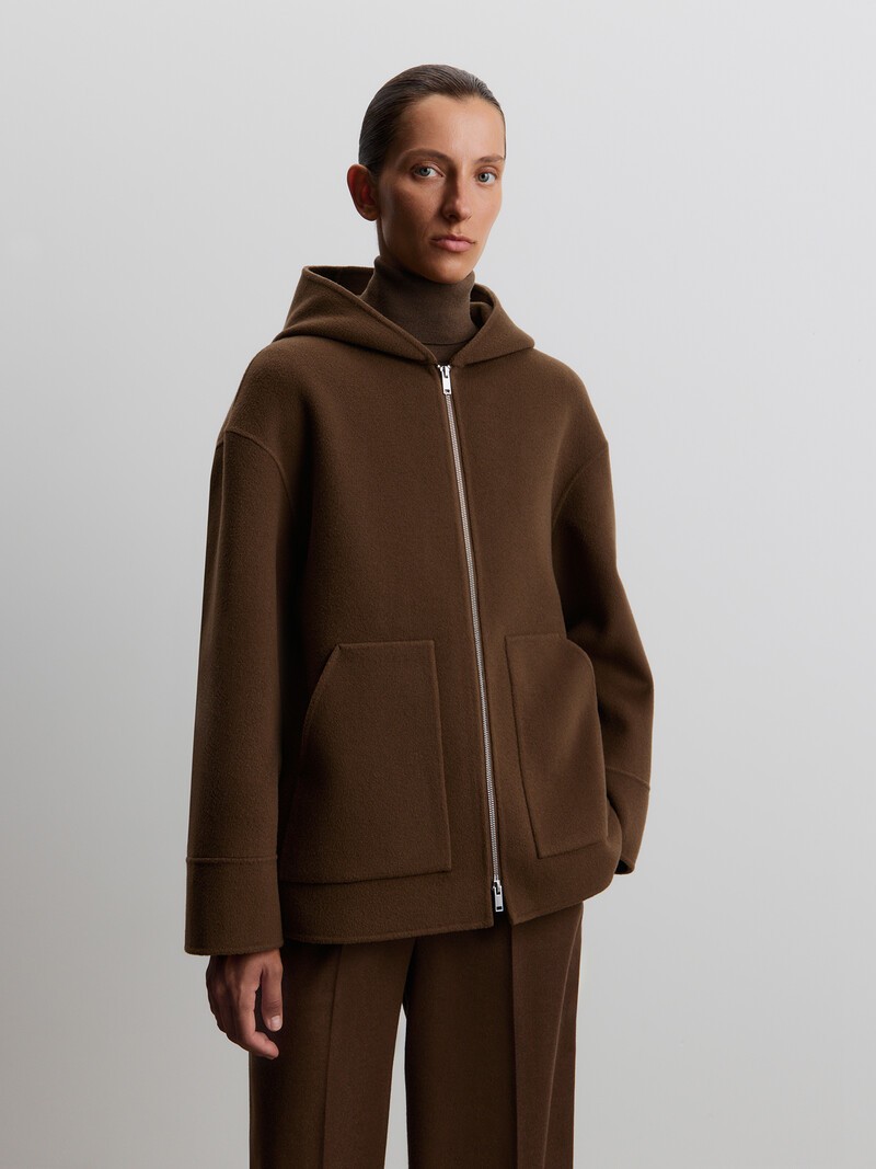 Короткое пальто с капюшоном и съемной подстежкой — напоминает худи благодаря свободному силуэту, но дарит гораздо больше возможностей для стилизации. Стеганая подстежка незаметно и быстро крепится — вы можете носить ее отдельно, как теплый слой под тренч или другое пальто. А для пальто мы выбрали мягкую шерсть австралийского мериноса и не ставили подкладку, аккуратно спрятав швы между двух слоев ткани. Капюшон не отстегивается.