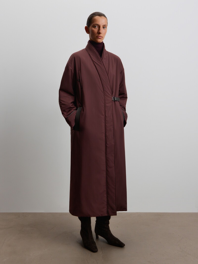 Длинное, легкое и свободное пальто-кокон — для комфортных расслабленных образов. Широкие рукава и планка, закрывающая шею, придают этой модели сходство с кимоно, а отделка кожей и кожаный ремешок с пряжкой расставляют деликатные акценты. Мягкую тонкую ткань дополнили утеплителем на натуральной основе, чтобы пальто лучше согревало в прохладные дни. Легкий инновационный утеплитель DuPont Sorona (100 гр) на основе растительного сырья согревает, как настоящий пух, не становится тоньше со временем и впитывает влагу. Его производство использует на 30% меньше энергии, а выбросы парниковых газов сокращаются на 63%. Сделано в Китае.