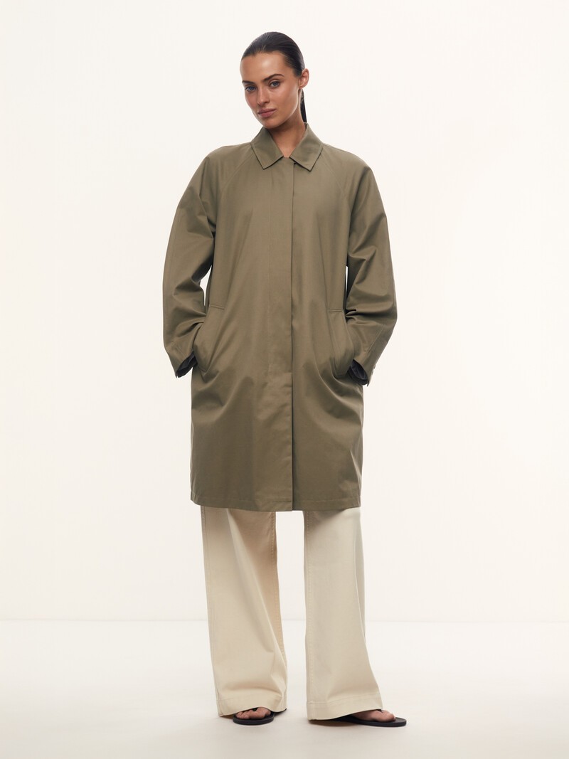 1. Новинка в нашей коллекции — лаконичный плащ для теплой погоды 2. Мы выбрали для него бархатистую ткань из хлопка, которая защитит вас от ветра и случайных капель 3. Идеально впишется в дождливые дни благодаря практичной длине миди 4. Акцентная деталь — отделка из натуральной кожи под воротником 5. Комфортная подкладка из шелковистой поливискозы в полоску