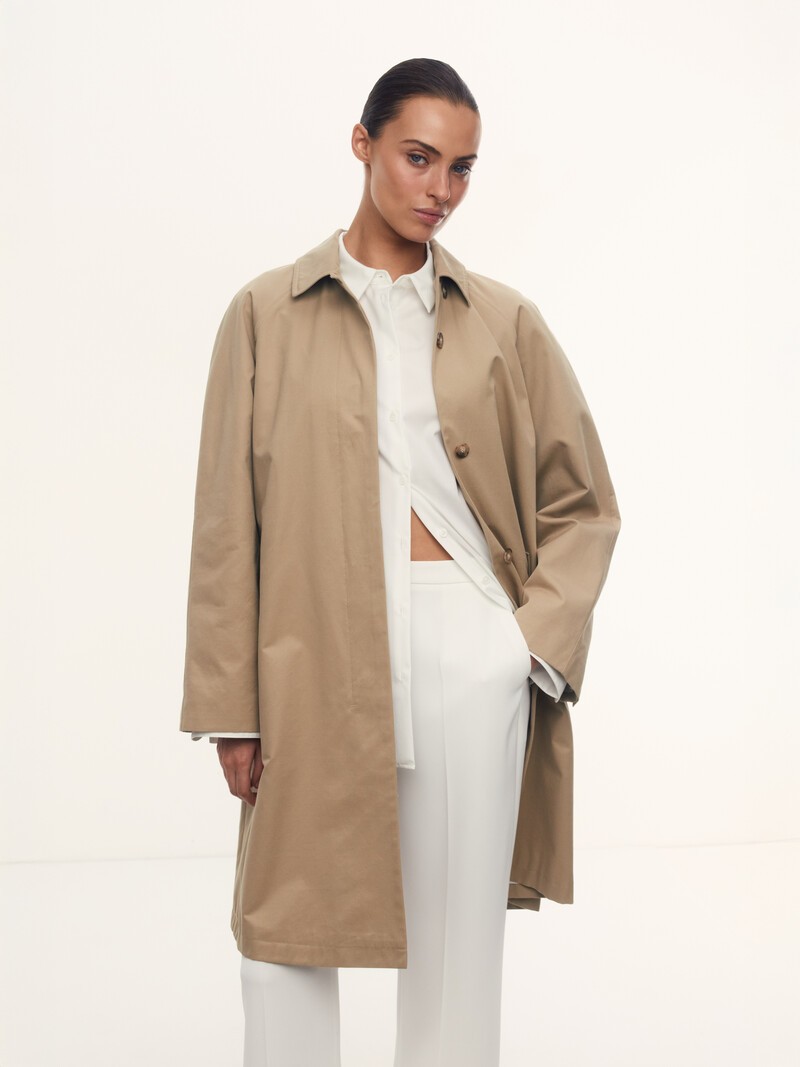 1. Новинка в нашей коллекции — лаконичный плащ для теплой погоды 2. Мы выбрали для него бархатистую ткань из хлопка, которая защитит вас от ветра и случайных капель 3. Идеально впишется в дождливые дни благодаря практичной длине миди 4. Акцентная деталь — отделка из натуральной кожи под воротником 5. Комфортная подкладка из шелковистой поливискозы в полоску