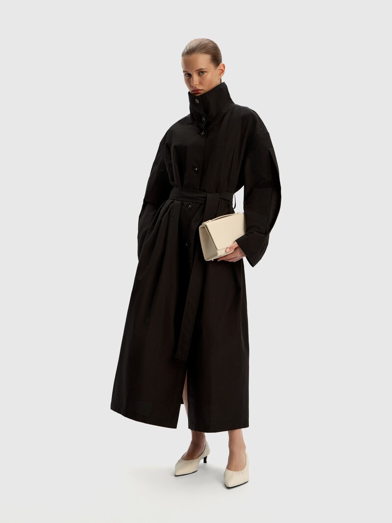 Объемный пыльник длины миди — альтернатива ветровке в теплые дни. Застроченные складки от плеч формируют свободный, летящий силуэт, а пояс поможет сделать акцент на талии. Материал — произведенный в Корее органический хлопок с переработанным полиэстером. Тонкая экологичная ткань, созданная с заботой о природе, имеет пропитку от влаги и защитит от легких капель. Мы сделали эту модель без подкладки: все швы с изнанки аккуратно закрыты хлопковой бейкой. Застегивается на пуговицы. Сделано в Китае.