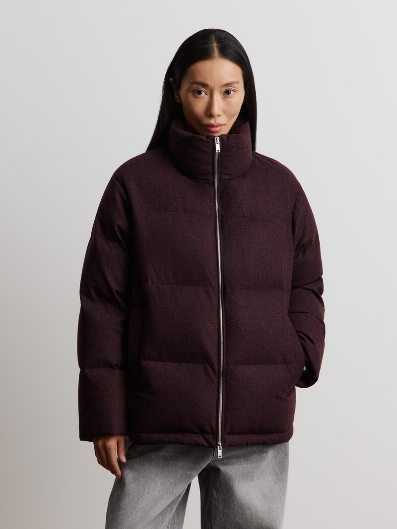 Самый мягкий пуховик в коллекции: ткань для него сделали из теплой шерсти мериноса и пушистого кашемира и дополнили мембраной, которая отталкивает влагу и грязь. Плотный наполнитель из невесомого утиного пуха согреет в морозы, а высокий воротник и вязаные манжеты защитят от ветра. Индекс качества Fill Power равен 750 — максимально высокий показатель для утиного пуха. В этом пуховике — 230 г пуха (размер S), поэтому в нем должно быть тепло до -15 °C. Сделано в Китае.