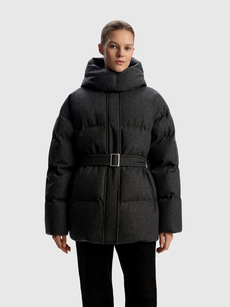 Универсальный свободный пуховик с акцентом на талии — наш бестселлер. Спущенная линия плеча позволяет носить его даже с объемным свитером, а вязаные манжеты из 100% шерсти комфортно прилегают к запястьям, сохраняя тепло. В этом сезоне мы выбрали для модели мягкий и приятный на ощупь материал из шерсти и кашемира, который отталкивает влагу благодаря мембране. Внутри — отборный утиный пух. Застегивается на двухзамковую молнию и кнопки. Индекс качества Fill Power равен 750 — максимально высокий показатель для утиного пуха.