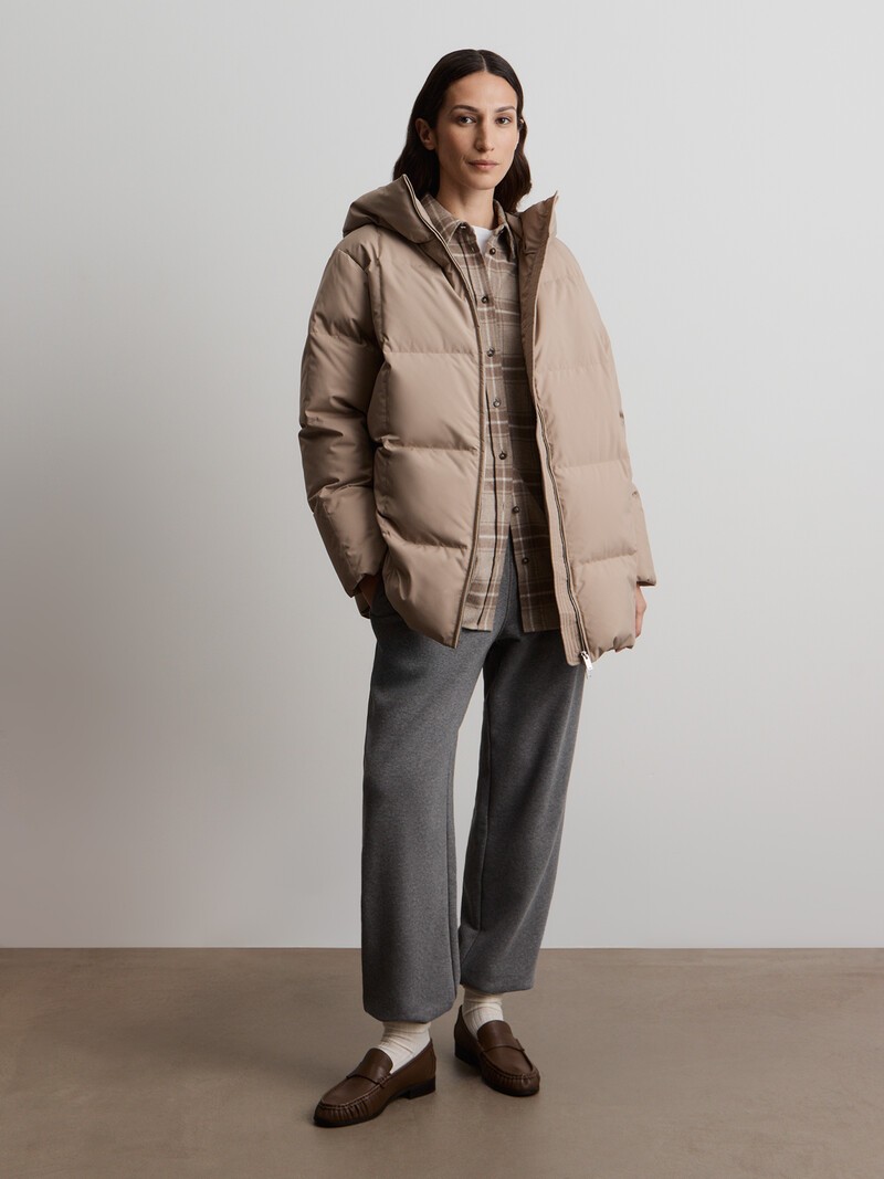Наш бестселлер — прямой свободный пуховик на каждый день. Под глубокий несъемный капюшон с широким воротником легко поместится снуд и даже объемный шарф. Квадратная стежка надежно фиксирует воздушный и теплый утиный пух, а мягкая и плотная матовая ткань защищает от ветра. Индекс качества Fill Power равен 750 — максимально высокий показатель для утиного пуха.