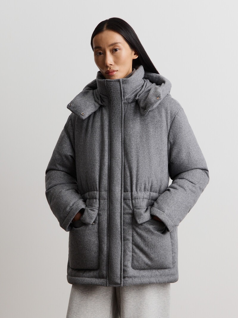 Для этого пуховика мы выбрали необычную ткань — очень мягкую смесь ангоры и мериносовой шерсти, с небольшим нежным ворсом и пропиткой от влаги. Утиный пух, вязаные детали из мериносовой шерсти и капюшон на кнопках помогут сберечь тепло и защитят от ветра. С помощью кулиски на поясе можно сделать силуэт прямым или подчеркнуть талию. Индекс качества Fill Power равен 750 — максимально высокий показатель для утиного пуха. В этом пуховике — 190 г пуха (размер S), поэтому в нем должно быть тепло до -15 °C. Сделано в Китае.