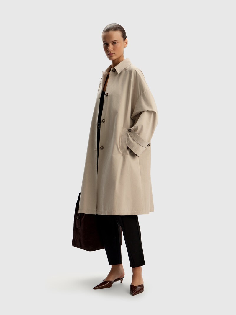 Легкий хлопковый тренч. Винтажный А-силуэт, длина до колена, отсутствие пояса позволят создавать сочетания практически с любыми вещами. Плотный бархатистый материал имеет пропитку от влаги, а шелковистая подкладка в полоску делает тренч более комфортным. Застегивается на пуговицы.