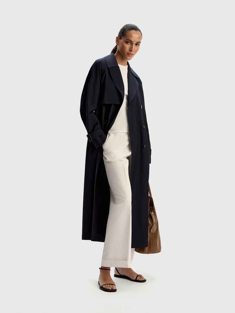 Двубортный тренч с поясом, объемный и длинный. Отлетные кокетки, кожаные пряжки и рукав реглан — узнаваемые классические детали, задающие тон всему образу. Материал — гладкий, плотный, с твиловым переплетением. Эту модель мы сделали без подкладки, но аккуратно обработали швы кантом, чтобы вы могли носить тренч нараспашку.