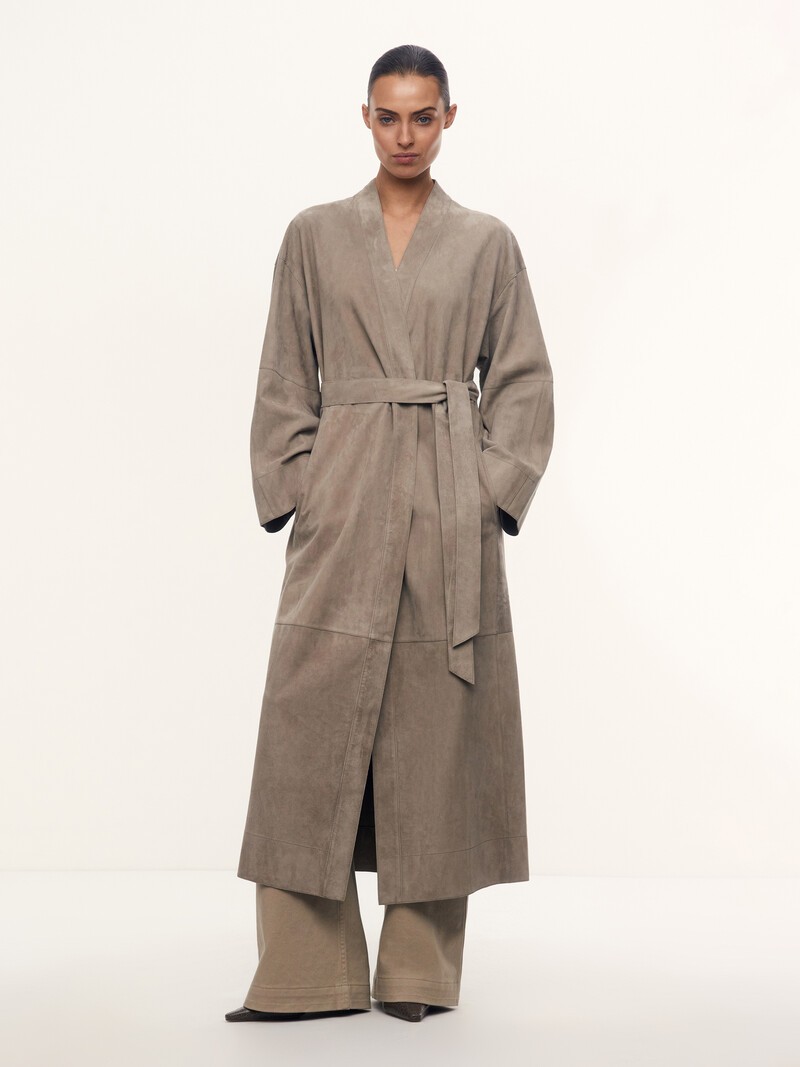 1. Замшу из козьей кожи для этого тренча мы нашли на одной из лучших кожевенных фабрик Индии, поставщика Armani и Versace 2. Тренч легкий: замша почти в два раза тоньше нашей обычной. Специальная обработка с изнанки позволила нам обойтись без подкладки 3. Комфортный свободный силуэт. Благодаря поясу можно подчеркнуть талию 4. Фабрика, с которой мы сотрудничаем, имеет наивысшую оценку организации по защите окружающей среды LWG — золотой сертификат. Это значит, что фабрика полностью соответствует требованиям экологической безопасности, имеет все необходимые очистные сооружения и заботится о здоровье сотрудников.