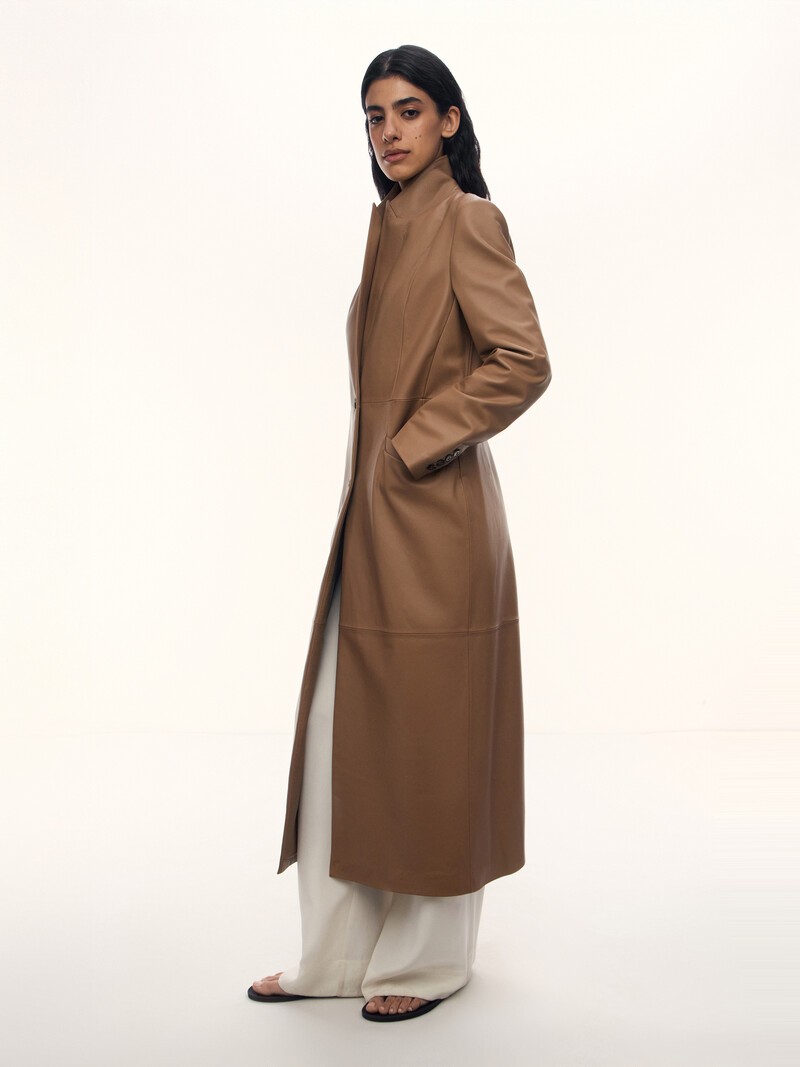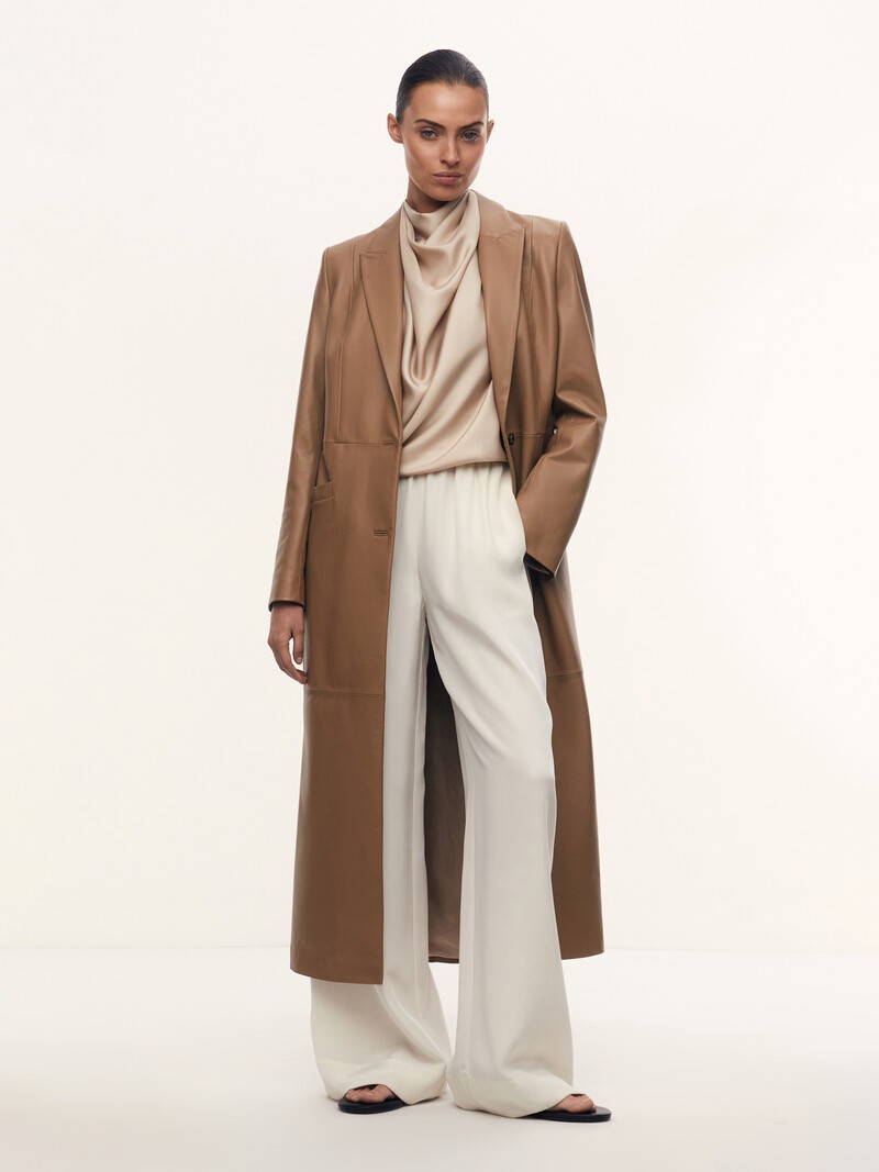 1. Новая версия нашего бестселлера — тренча, который мы создали совместно с Натальей Водяновой 2. Мы выбрали для тренча мягкую и пластичную кожу ягненка полурастительного дубления — она годами сохраняет природную прочность 3. Подчеркивает и визуально вытягивает силуэт благодаря полуприлегающему силуэту и аккуратной линии плеча с тонким подплечником 4. Для вашего комфорта добавили шелковистую подкладку на основе купро 5. Поставщик, с которым мы сотрудничаем, имеет наивысшую оценку организации по защите окружающей среды LWG — золотой сертификат. Это значит, что фабрика полностью соответствует требованиям экологической безопасности, имеет все необходимые очистные сооружения и заботится о здоровье сотрудников