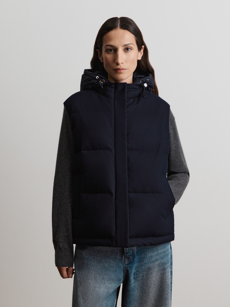 Объемный жилет с декоративной строчкой — наш бестселлер. Высокий воротник, утяжка по нижнему краю, удлиненная спинка и глубокий капюшон защитят вас от ветра в холодные дни, а достаточно глубокая пройма позволит надеть под низ даже свободный джемпер. Верхняя ткань — натуральная, дополненная мембраной шерсть с добавлением кашемира, придающего материалу мягкость. Утеплитель — 90% отборного утиного пуха и 10% срезанных кончиков перьев, которые помогают пуху не слеживаться в комочки. Застегивается на молнию и планку с кнопками. Индекс Fill Power — 750, максимально высокий для натурального утиного пуха.