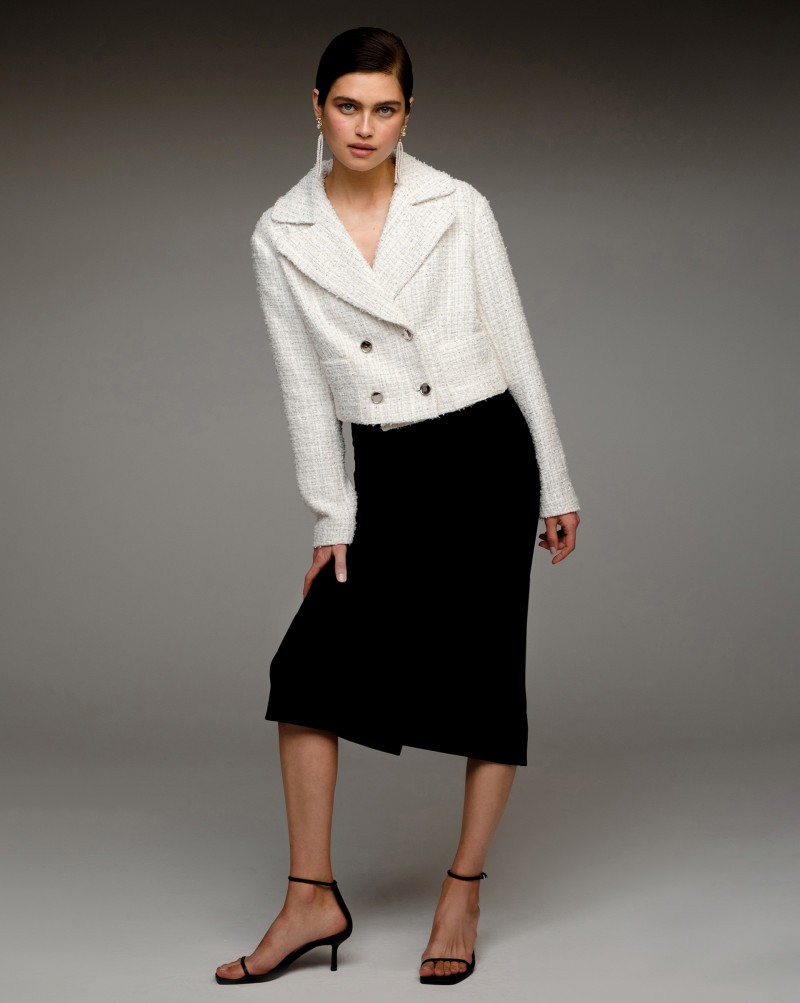 Твидовый жакет. Укороченный жакет с широкими лацканами и прямыми длинными рукавами. Небольшие накладные карманы, застежка на два ряда пуговиц с металлической отделкой. Выполнен из фактурной твидовой ткани с добавлением тонкой нити люрекса. Сделано в России. «Такой жакет можно носить с любыми брюками, например, широкими из струящегося бархата. Чтобы создать классический спокойный образ, можно подобрать юбку из такой же ткани. А еще интересный вариант — надеть жакет с брюками из лакированной кожи и босоножками». Ирина и Марина Голомаздины