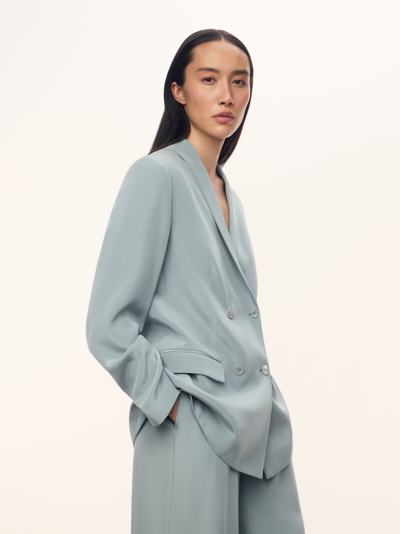 1. 100% шелк Mulberry плотностью 30 момми. С помощью особой обработки эту ткань сделали мягче обычного шелка, она не блестит и не скользит по коже 2. Для дня и вечера: благодаря материалу и лаконичному силуэту жакет легко стилизовать для разных случаев 3. Тонкий подплечник формирует четкую линию плеча 4. Пуговицы из натуральной ракушки 5. Дышащая и легкая подкладка из вискозы с шелком делает жакет плотнее и долговечнее