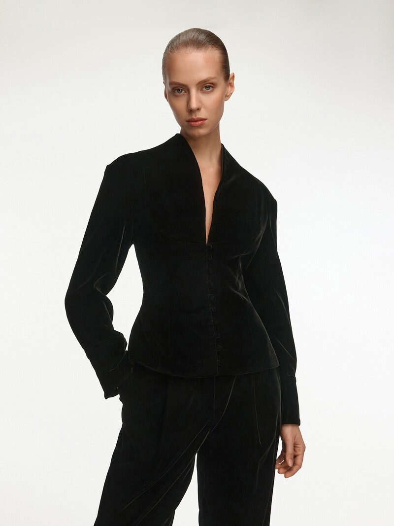 1. Бархат для этого топа создан в Японии на фабрике Agehara Velvet, которая производит ткани для Armani, Comme Des Garcons и Prada 2. В основе материала — вискоза и купро, поэтому он мягкий, дышащий и пластичный 3. Прорезной бархат — долговечный: ворс не осыпется и не отклеится после химчисток. Ткань дает глубокие переливы цвета и выразительный блеск в складках 4. Мы придали жакету сходство с корсетом и сделали пышными рукава, чтобы создать силуэт песочных часов 5. Благодаря мягкой подкладке из купро в жакете комфортно, а отделка из дикого шелка подчеркивает глубину бархата
