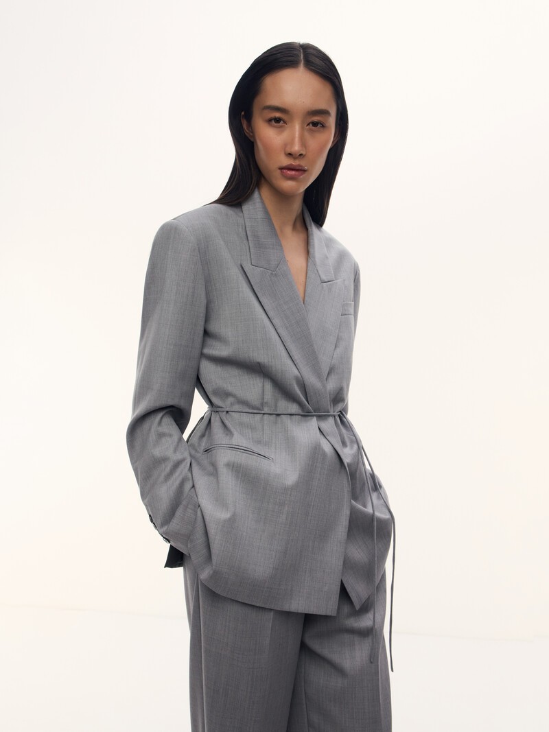 1. Легкий жакет из тонкой 100% шерсти — гладкой мягкой ткани, в которой вам будет комфортно и в межсезонье, и летом 2. Мы улучшили силуэт: жакет стал более компактным и аккуратным. Изящный пояс помогает подчеркнуть талию 3. Особенная деталь: спинка жакета выполнена из подкладочной ткани на основе купро, которая выглядит и ощущается как шелк